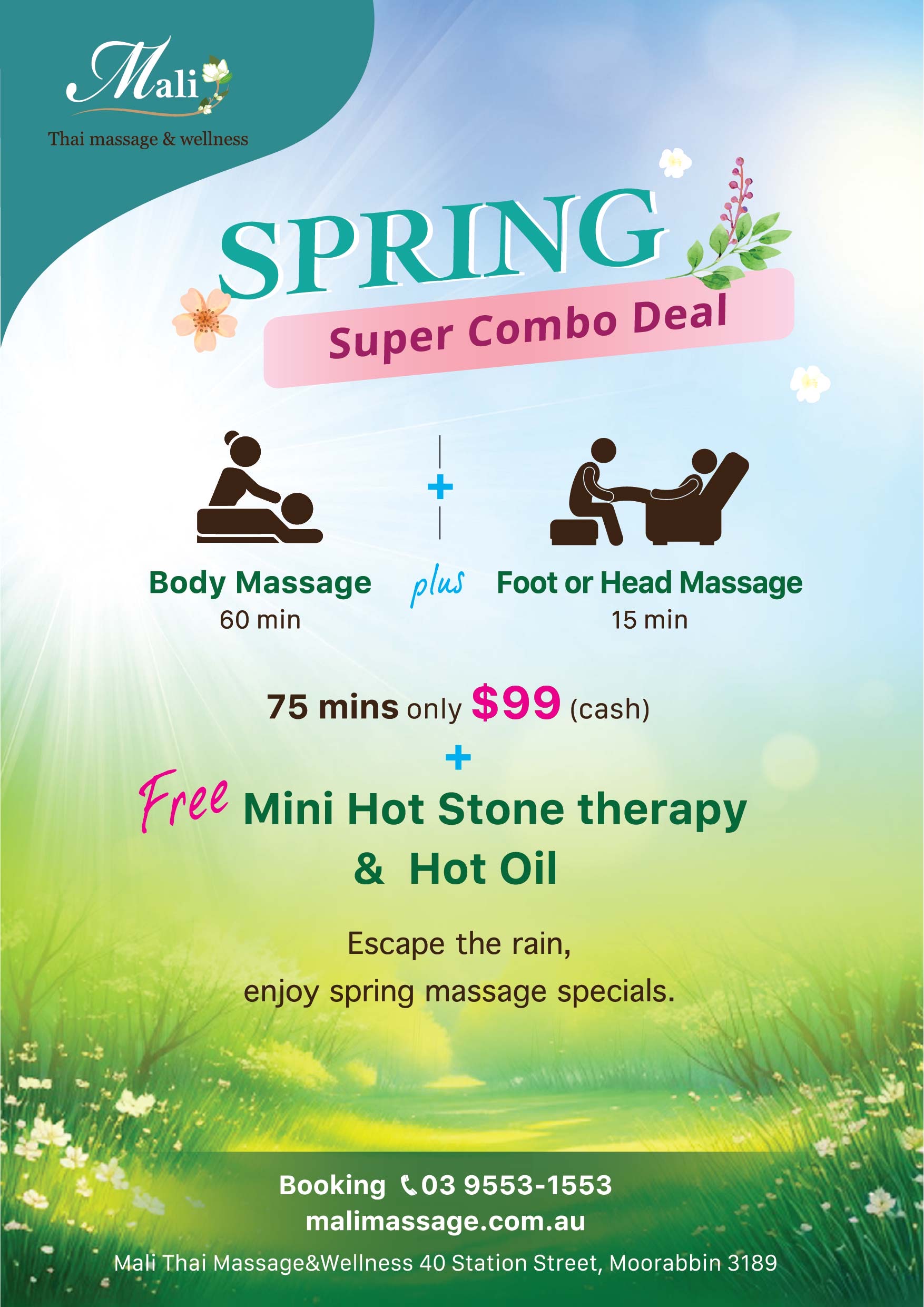 Mali Thai Massage & Wellness also known as Mali Traditional Thai Massage is nestled in Station Street, Moorabbin and was established over 7 years ago. At Mali Thai, we aim to provide a professional massage service, freeing our clients from pain & stress from daily lives. Our massage treatments are designed to rejuvenate our clients and restore them to a more relaxed version of themselves. Our therapists are using their knowledge and experience to individualize every treatment to suit your need.